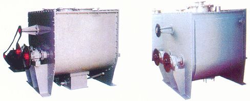 性能特点一该机通过两根等速反向旋转轴上特殊布置的桨叶,使物料作径向、环向、轴向三向运动,形成复合循环,在极短的时间内达到均匀混合。一可进行固(粉)—固(粉)(粉体粒度300—2000um)混合。一根据用户要求,还可以另加喷液及夹套装置,使之可作为固(粉)—液(含液量<15%的混合及干燥设备使用。