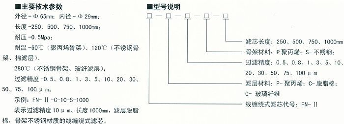 ■型号说明示例:FN—III-5-1000-B表示:过滤精度为5 u m,长度1000mm,端盖为B型的聚丙烯折叠式滤芯。 |
