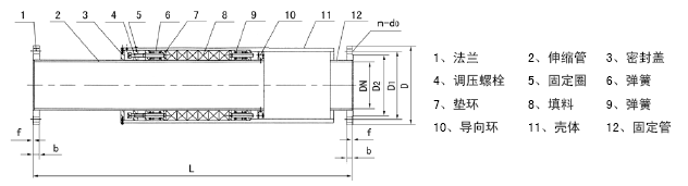 一、产品概述 填料式管道自动补偿器是我公司采用先进技术基础上自行开发研制而成的新型补偿装置,该产品由于其补偿量 大,特别适用于长距离直线敷设的管网,它与传统的热力管道敷设的补偿器(方形、波纹形、球形)相比,具有体积小、补 偿能力大、安装方便、密封性能可靠、使用寿命长、成本低等显著优点,而逐渐被各大厂家所使用,特别在电力、城市供 暖、石油化工等行业具有广阔的应用前景。 二、技术指标 最高工作温度:≤250℃ 公称压力:≤2.5MPa 标准补偿量:-20~300mm 适用介质:热水、蒸汽、热油等 三、工作原理 填料自动管道伸缩补偿器(见结构图),它主要由伸缩管、密封盖、调压螺栓、弹簧、固定圈,导向块及壳体组成。 使用时,可采用伸缩管及固定管端的法兰直接开始热胀或冷缩,可通过两侧的弹簧自动补偿填料的松动,使填料所需预压 力,从而达到密封的目的。另外,考虑到介质进入管道时,冷热变化会产生压力波动,为防止补偿器会产生径向窜动,我 们在补偿中设计特殊的导向环,导向环上又具有若干个平衡孔,以平衡介质的压力。 四、产品结构及连接尺寸 五、性能特点 1、补偿量大,标准补偿量为-20~300mm,并可按用户需要设计。 2、补偿器的伸缩管采用不锈钢制作,加以精磨工艺,不仅具有良好的防腐蚀能力,而且提高了表面的护磨损能力。 3、管道的联接可采用法兰或直接对焊联接,结构紧凑,占用空间小,安装方便。 4、精心设计的弹簧力是通过大量实验而得出的,因而具有密封性能优越,永不泄漏的优点。 5、填料为我厂特殊研制开发的,能适用于高温高压的管道密封。